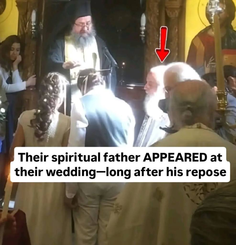 The photograph was taken last year at a wedding in Glyfada by a child. The priest dressed in white, holding the Gospel, is the spiritual father of the newlyweds, who had already reposed long before. He was not visible at the time the photo was taken, yet he appeared in the image. One can see the glorious light surrounding him…Saintly Father, please pray for us!!