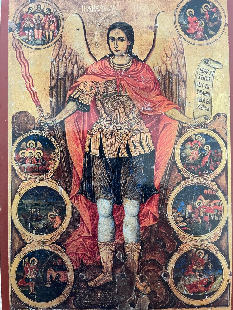 Last week, Archangel Michael, became central in my life. First, my spiritual father arrived and rescued me after a summer of fires, all kinds of fires, and carried me in his arms like the Good Shepherd. He also brought me this icon of the Archangel Michael to protect me from the attacks of the evil one “through the valley of the shadow of death.