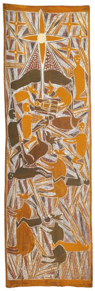 Mawalan Marika (Rirratjingu/Australian, 1908-1967), “Nativity,” ca. 1960. Natural earth pigments on eucalyptus bark, 109.5 x 33.8 cm. “The baby Jesus in the manger is surrounded by animals, presumably sheep and a cow, under a variation on a traditional wet season shelter built on forked sticks. The other figures in the composition include the Virgin Mary, Joseph and three other figures, probably the three wise men offering gifts. The wise men are also depicted riding horses in the lower half of the painting and the star that guided them dominates the upper register.” Source: http://www.invaluable.com/auction-lot/mawalan-marika-,-circa-1908-1967-nativity-scene-n-92-c-3jb73kijww