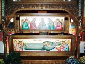 St. Nectarios on his coffin, locked outside the church (!), waiting the boat to Aegina … a sad symbol of the persecution and slander he suffered all his life for Christ, of the bitter Cup he drank. That closed door … and the open gate to Paradise with angels and hierarchs welcoming the Saint! + Asking for his holy prayers ….