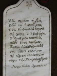 It turned out that Father Methodios was the parish priest at Thessaloniki St Gregory Palamas cathedral, and he was very excited about something and most eager to share his news with me! His tama to St Paisios —to build him a church—would be brought to fruition in just a few days, this Saturday evening before Pentecost, near Sarakina, a small, nearby town, 45’ drive from Thessaloniki. The main church will be consecrated to St Paisios, and the two chapels to St Gregory Palamas and St Porfyrios! Further on, he explained to me how he had offered the donation of 7.5 acres and how the monastery of the Assumption in Panorama had undertaken all the work. In the end, Father Methodios invited me to the the laying of the Foundation Stone for the construction of the Holy Church of Saint Paisios, gave me his private mobile number, supplied all necessary names and references, monastery ones included, offered ample navigation guidance for the trip to the ‘unknown’ he was inviting me, and kept repeating that I should come, that St Paisios had arranged our meeting at the bus stop!