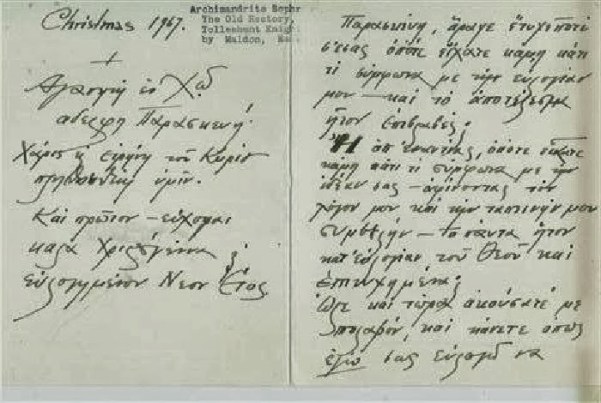 A good wish card which the blessed Elder sent during Christmas 1967, when Paraskevi was going through some difficult times because of the illness of a close relative.