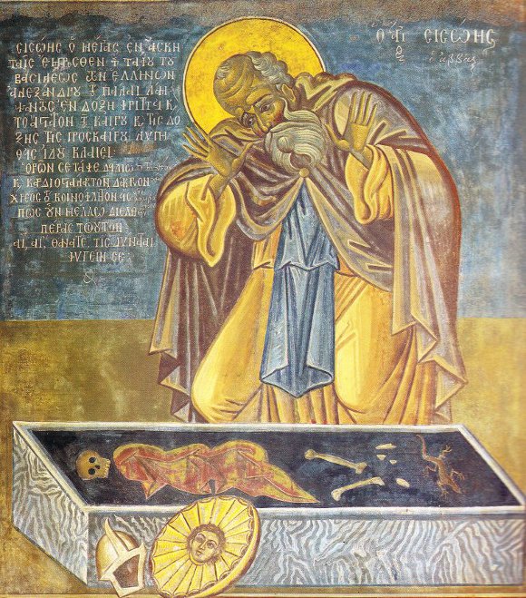 (*) “Sisoes, the great ascetic, before the tomb of Alexander, king of the Greeks, who was once covered in glory. Astonished, he mourns for the vicissitudes of Time and the transience of glory, and tearfully declaims thus: ‘The mere sight of your tomb, dismays me and causes my heart to shed tears, as I contemplate the debt we, all men, owe. How can I possibly stand it? Oh Death! Who can evade you?’