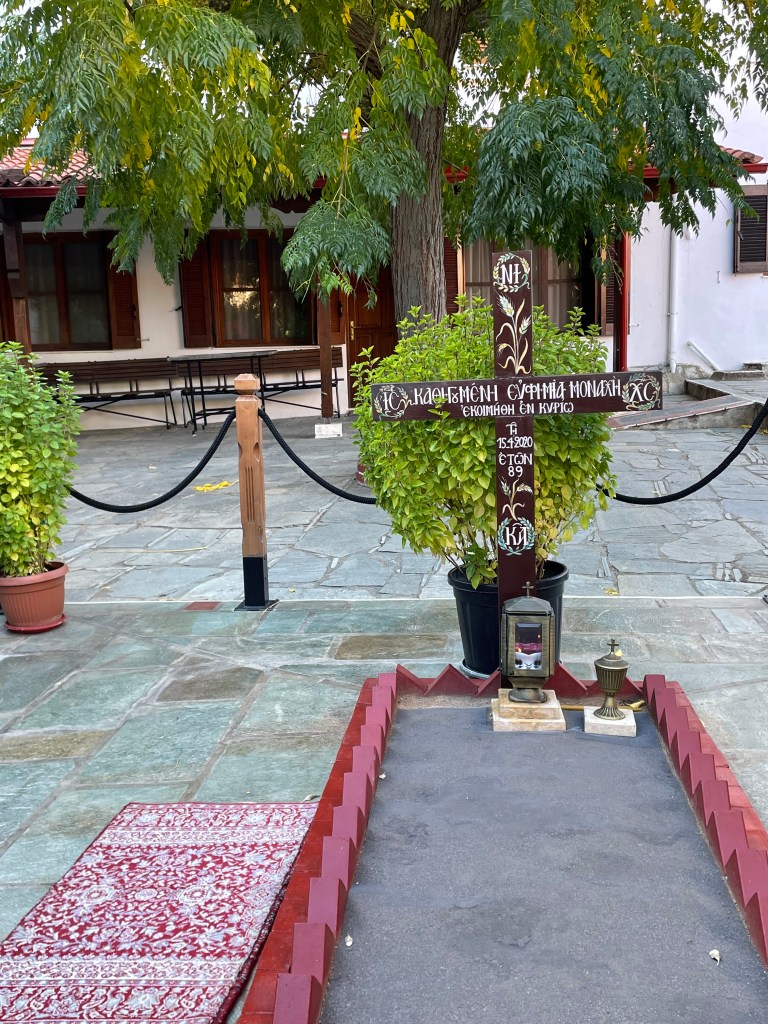 Next, we kneel at Gerondissa Akylina‘s grave. Saint Paisios characterized her as “Gerondissa of Gerondisses; ie. Abbess of Abbesses” and Saint Porphyrios of Kausokalyvite called her “Cherub with golden wings”. Her canonisation is expected to take place soon and her relics are now displayed inside the Ascension Church, next to those of St.George Karslides, for veneration too.