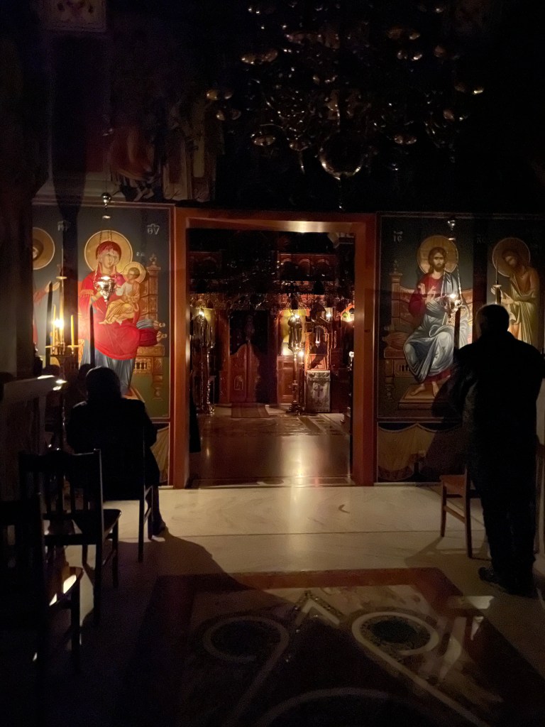 I feel separated from other people, all people, too! Is anybody here?! What a contrast to last night’s feast! There, at the vigil in St. Demetrios church, in Thessaloniki, an amazing Resurrectional experience unfolded in a packed church! So many holy chalices all around the Royal Doors! So many people receiving Holy Communion and then, at the dismissal of the holy liturgy, flooding the streets outside the church. Here, I am all alone — the silence of the heart! And what a deafening, thundering silence that is!