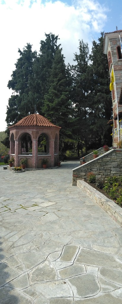 The meal at the Trapeza was very formal and characterized by prayer, reverence and serenity, as the process of the meal is a ritual. The readings were on the Gospel reading for today, esp. the line “The Lord said, “As you wish that men would do to you, do so to them. … Be merciful, even as your Father is merciful”, and they were from St Gregory Palamas and St Paisios the Athonite. At the end, Gerondissa Melani spoke for a few minutes, highlighting a few points, and then we were ceremoniously escorted outside by the sisters, to the monastery gardens.