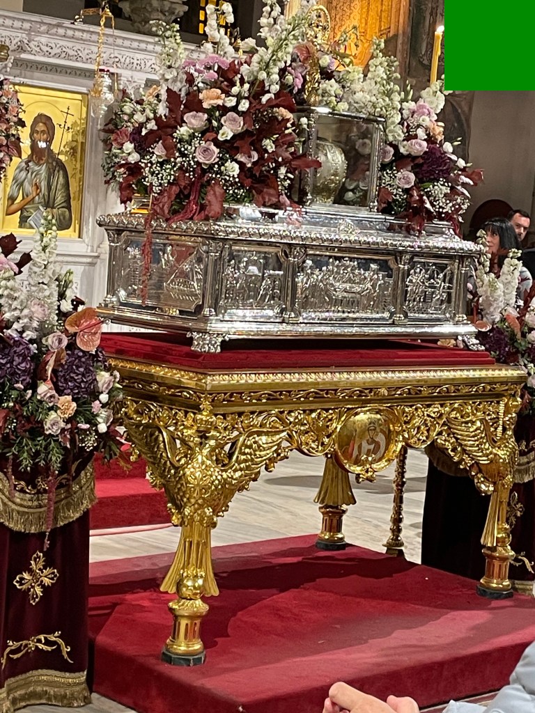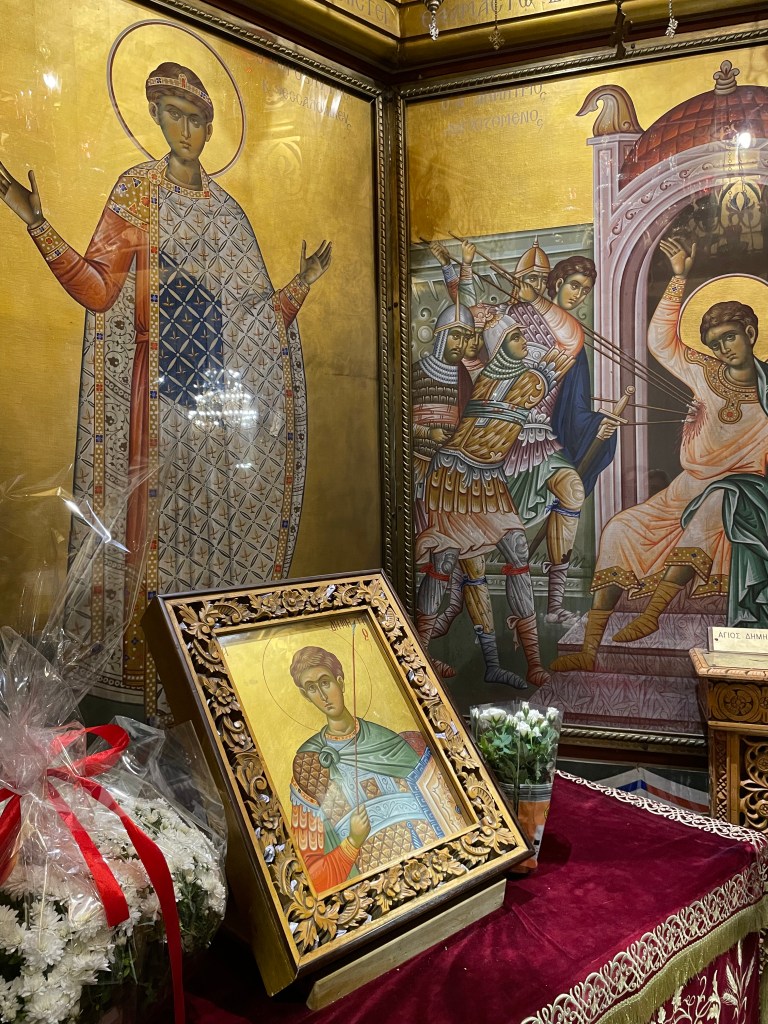 Like Easter Sunday, the priests begin with a procession, carrying the Saint’s icon all around the church, proceeded with a Gospel reading in front of the Royal Doors, and a variation of the well-known melody of “Christ is Risen” is chanted lots of times, with words adapted to St. Demetrios’ martyrdom, while bells are ringing. Easter Matins follow, where the canon of the Saint is chanted, based, in melody and verses, on St. John Damascene’s Paschal Canon.
