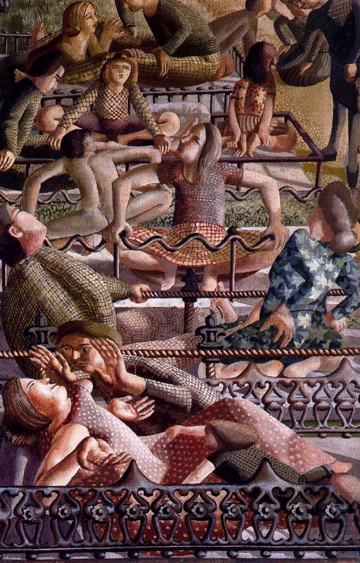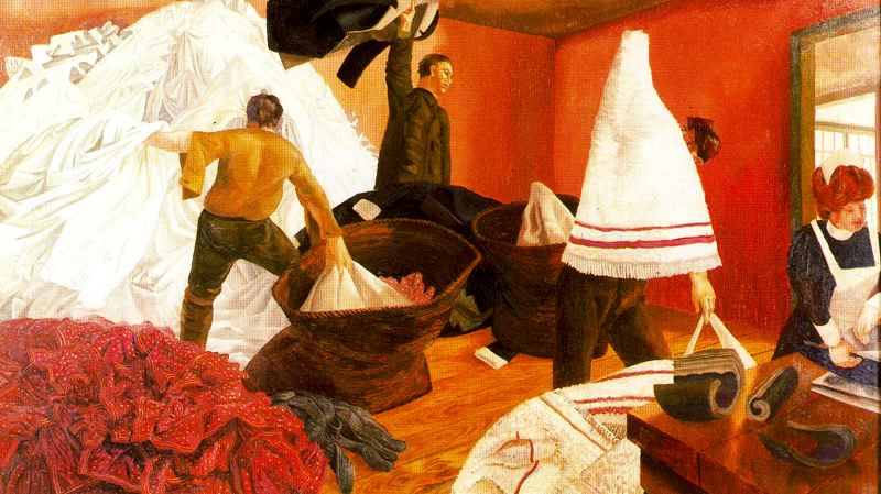 The other walls depict the everyday life that Spencer himself experienced. Even with titles such as Sorting and Moving the Kit-Bags Spencer imbues the paintings with such beauty and meaning that as he himself says, “they don’t look like war pictures, they rather look like heaven”.The everyday activities of the soldiers are transformed from banality. Saint Augustine, whom the artist had read, believed that even menial work could be a way of glorifying God. He continues, “the picture is supposed to be a reflection of the general attitude and behaviour of men during the war”, when a soldier would fondly remember the “caress of a sweetheart” or “sitting in his doorway chatting to his neighbours”. For Spencer himself the five years it took to complete the works was a means to “recover my lost self”.