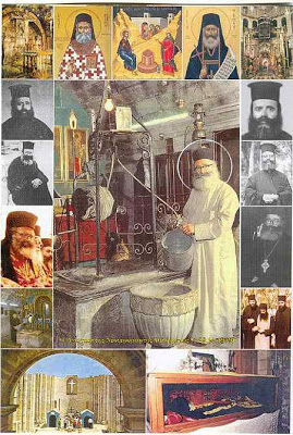 Central photograph of St. Philoumenos the New Righteous Hieromartyr, the Cypriot, at Jacob’s Well where Christ spoke with St. Photini. Surrounding are other pictures and icons of St. Philoumenos and associated scenes. He was martyred on November 16th/29th 1979