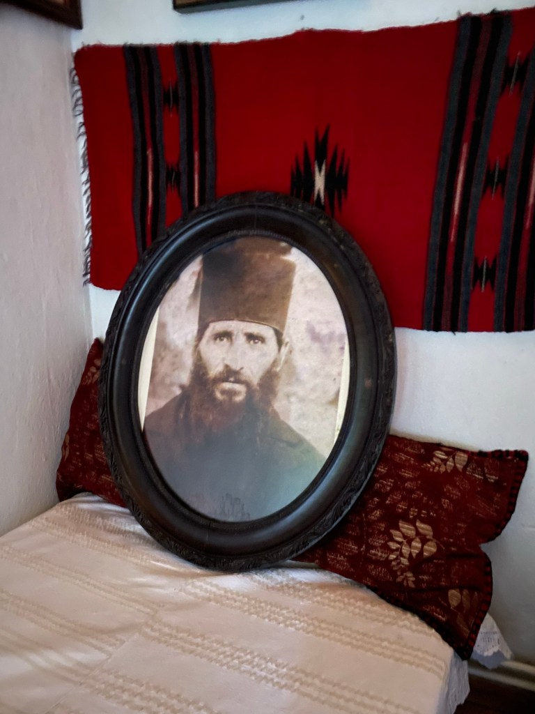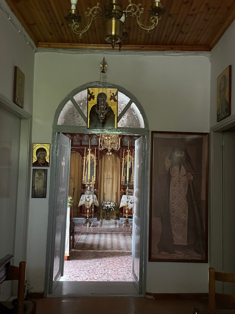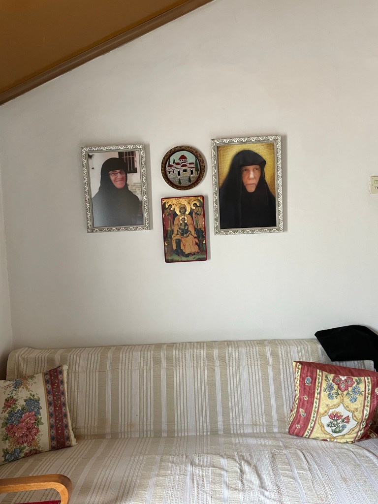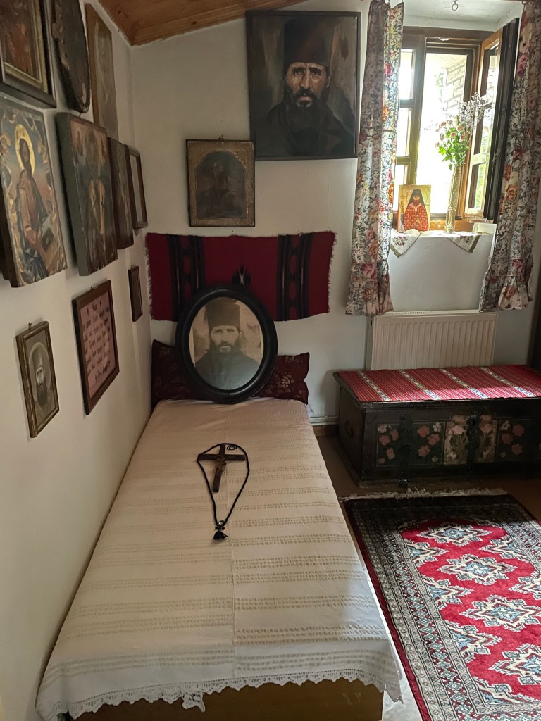 The cell next door to the Saint’s cell. Originally used for storage by the Saint. Later, + Gerondissa Akylina moved here in the final years of her life and had the care of the now Gerondissa Porfyria (cf the framed photos over the bed).