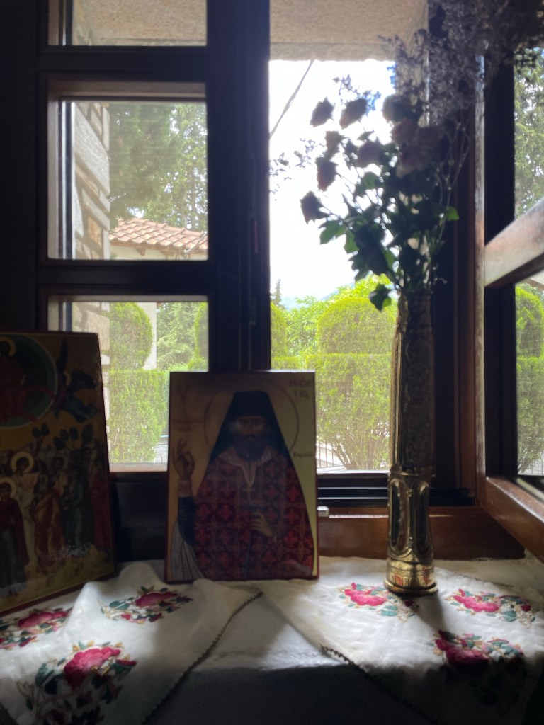 At the Ascension of our Lord feast, the cell of the Saint is open all day for pilgrims, a rare privilege, and Gerondissa Porfyria assigned my obedience for today to “guard” the chapel, the Saints’ relics which the Saint had brought from Russia (and his own of course), and the Saint’ holy cell which all have the fragrance of myrrh. I was speechless at the honour and the blessing!