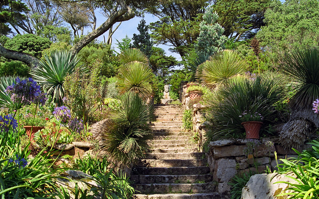 Surrounded by sea and in the warmth of the Gulf Stream the climate is exceptionally mild and totally frost free in most years. With south facing terraces, these gardens have often been referred to as Kew gardens without the roof, because in mainland UK, you would only find these plants in a botanical garden glass house.